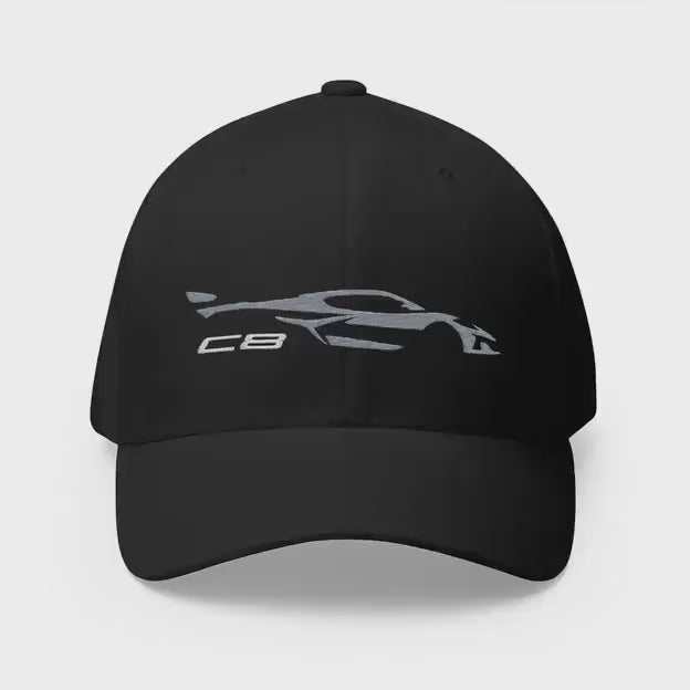 Corvette Grey C8 Silhouette Baseball Cap, Flexfit Hat, Stretchy Band, Black Hat, Corvette Gear, Embroidery