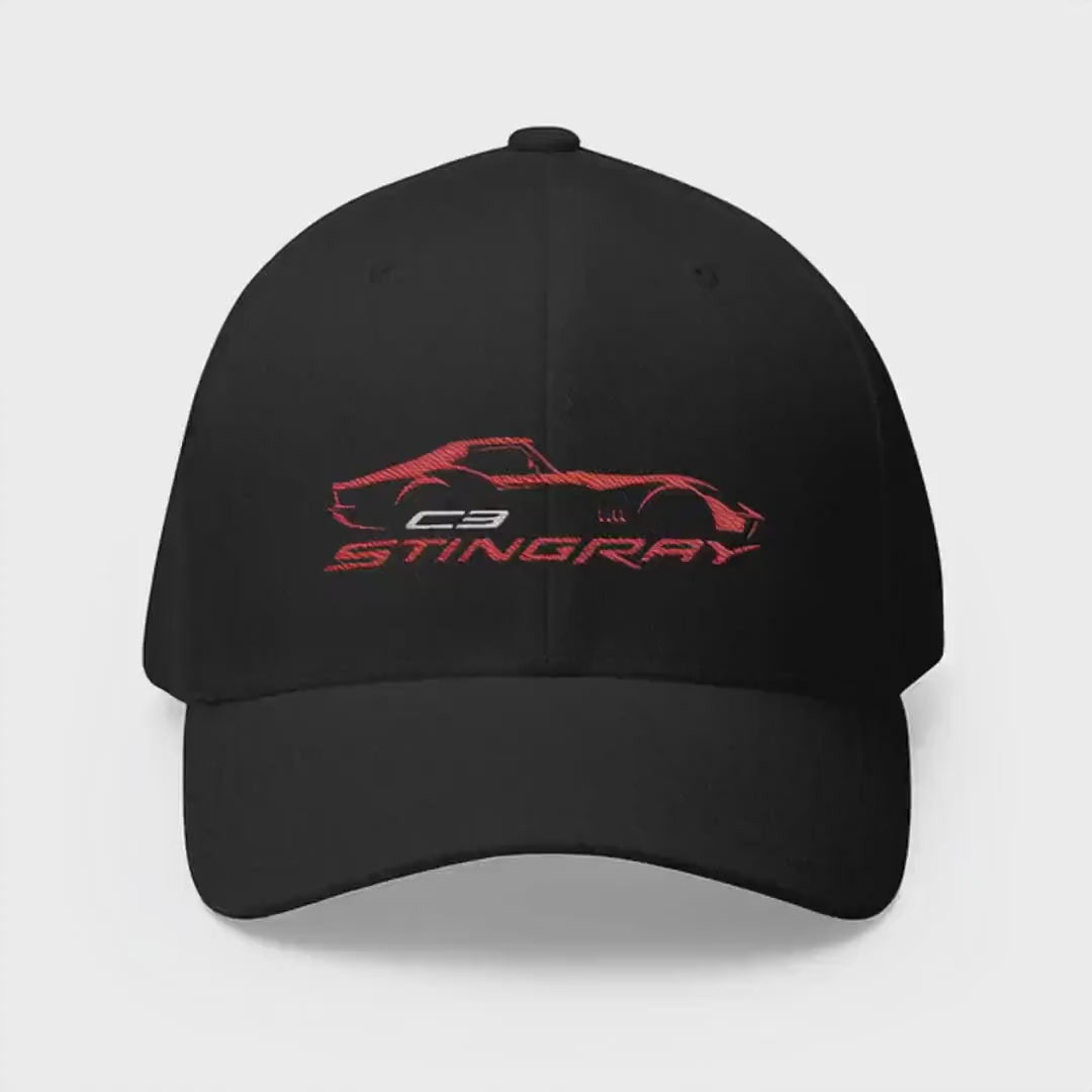Corvette Red C3 Stingray Silhouette Baseball Cap, Flexfit Hat, Stretchy Band, Black Hat, Corvette Gear, Embroidery
