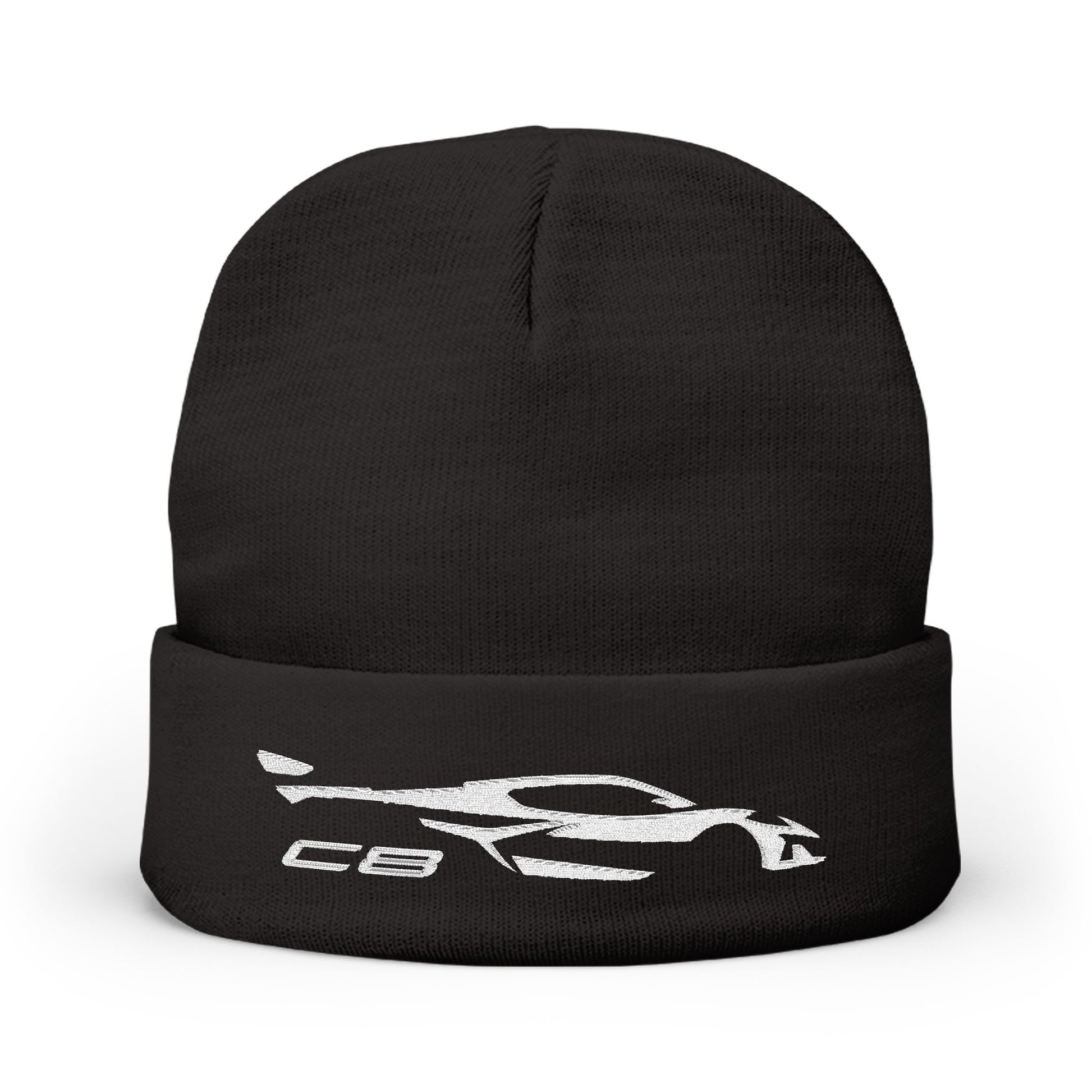 Corvette White C8 Embroidery Winter Beanie, Knitted Hat, Cozy Cap, Outdoor Accessory, Unisex, Gift for Him, Gift for Her